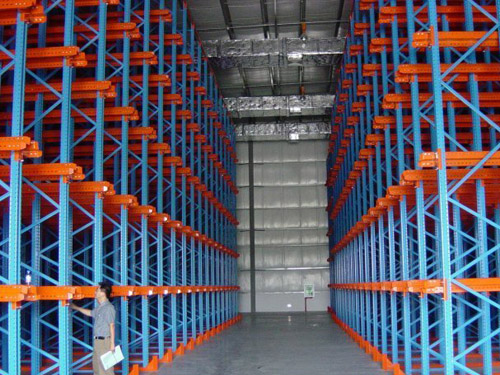 貫通式貨架又稱通廊式貨架或駛?cè)胧截浖。貫通式貨架可供叉車(或帶貨叉的無人搬運車)駛?cè)胪ǖ来嫒∝浳铮m用于品種少,批量大類型的貨物儲存。貫通式貨架除了靠近通道的貨位,由于叉車需要進入貨架內(nèi)部存取貨物,通常單面取貨建議不超過7個貨位深度。為提高叉車運行速度,可根據(jù)實際需要選擇配置導(dǎo)向軌道,與貨位式貨架相比,貫通式貨架(駛?cè)胧截浖埽┑膸炜臻g利用率可提高30%以上,貫通式貨架(駛?cè)胧截浖埽⿵V泛應(yīng)用于批發(fā)、冷庫及食品、煙草行業(yè)。