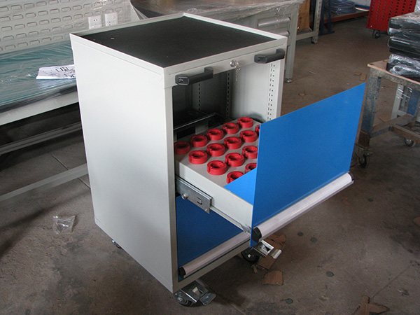 刀具架適用于加工車間、維修車間等場合,可分類放置刀具,并可靈活移動方便取用,F(xiàn)代貨架廠生產(chǎn)的HY-HSK系列刀具車成多邊成型的前后側(cè)板上有模數(shù)化的人字孔,可將刀具座掛板按水平或15、30傾斜放置,方便多種刀具的存放。高強度腳輪,車前為兩個定向輪,車后為兩個萬向帶 剎車輪,推行平穩(wěn),方向性好,剎車固定后不會滑動。結(jié)構(gòu)特點 1.配有標簽,明確分類. 2.快速拿出工具,節(jié)約查找時間. 3. 配有輪子,便于移動. 4.抽屜可拉出100%。